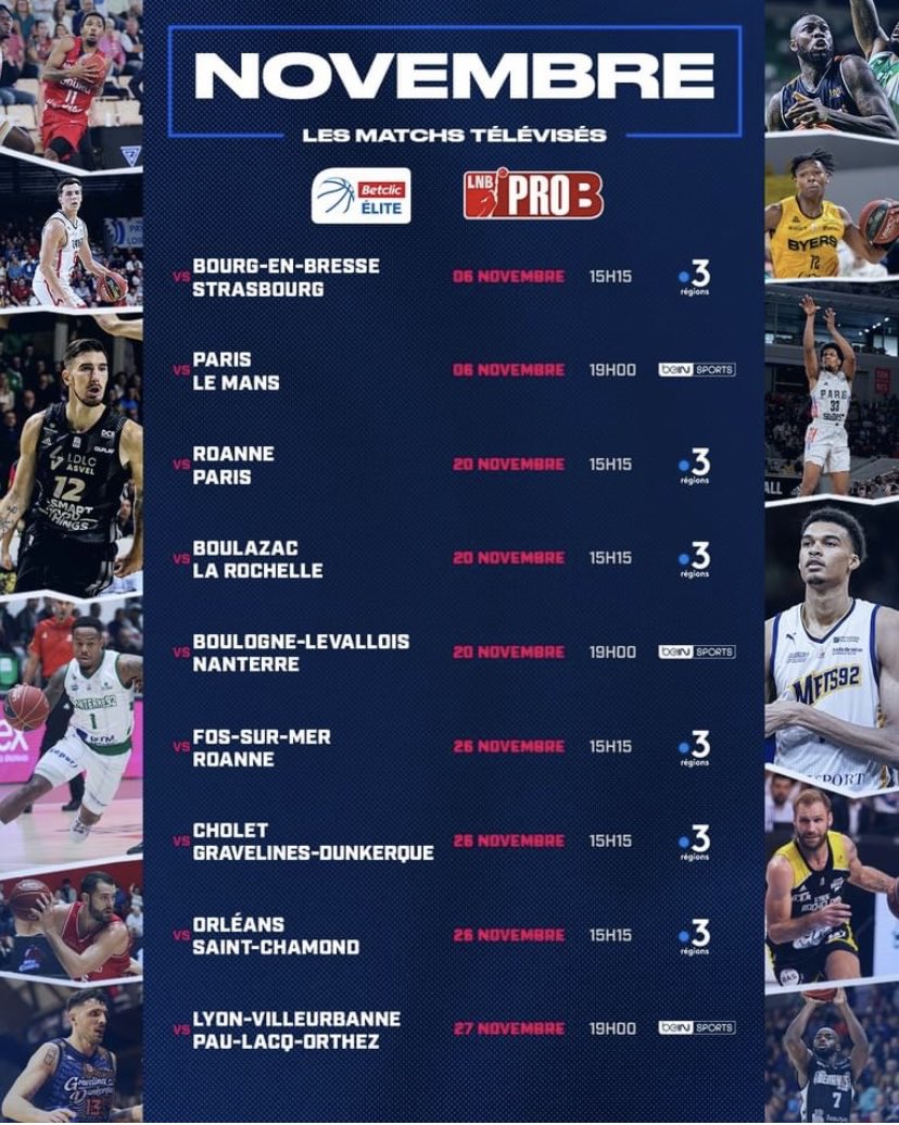 Nous aurons droit à 4 matches de Betclic Elite et 2 matches de Pro B sur les antennes de France 3 et 3 matches sur BeIN Sports.