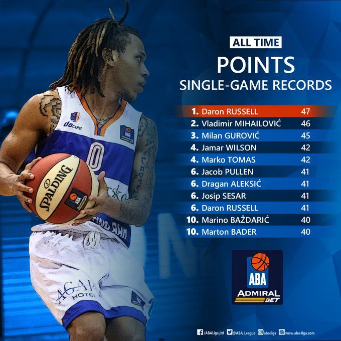 Avec 47 points, le meneur de jeu américain Daron « Fatts » Russell (1,80 m, 24 ans) a battu le record de points sur un match de l’ABA League lors de la victoire de Mornar sur Zadar (100-91).