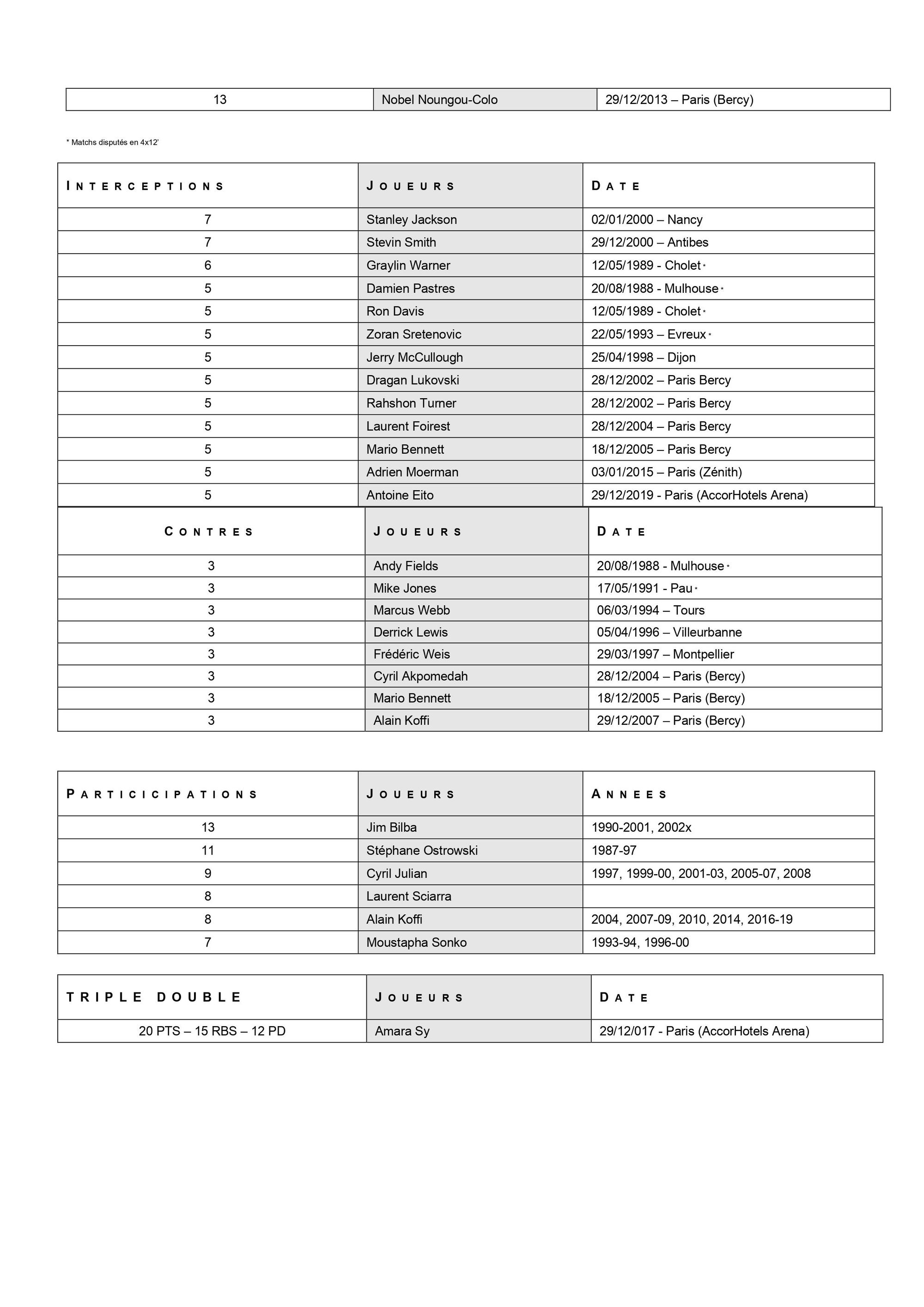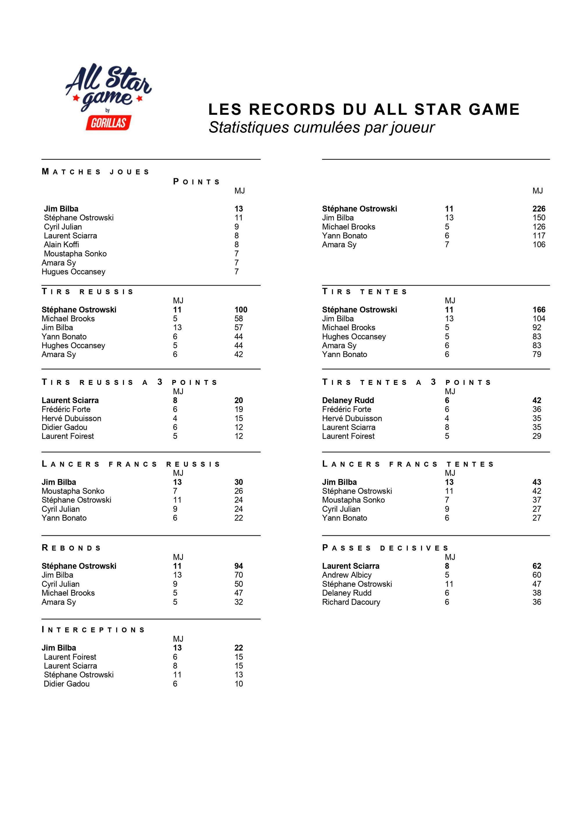 - 13 : Jim Bilba est le recordman de sélection au All Star Game depuis sa création, et a été choisi 12 fois consécutivement de 1990 à 2001, avant d’effectuer sa dernière apparition pour la première à Bercy.