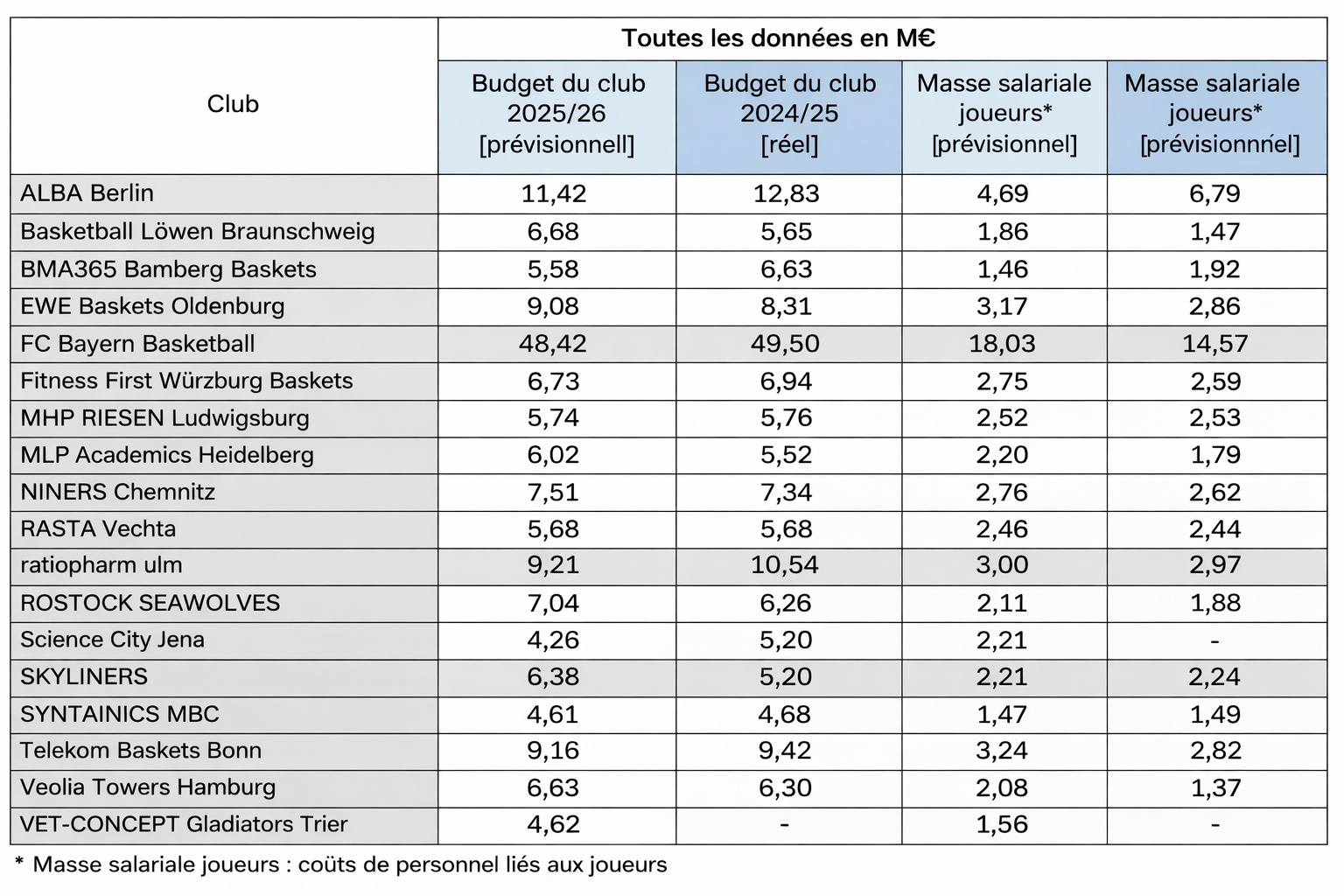 Le Bayern présente un budget quatre fois supérieur à celui de l'ALBA Berlin, seul autre club à dépasser les 10 millions. L'équipe de Munich est actuellement leader du championnat national (8-1) mais avant-dernière d'Euroleague (5-11).
