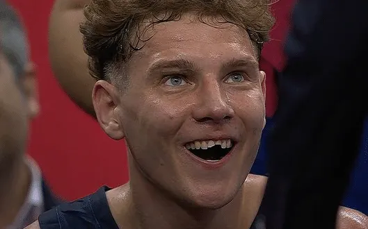 Le Lituanien s'est cogné la bouche sur le sol lors du deuxième quart-temps et il s'en est allé au vestiaire pour revenir quelques minutes plus tard et rejouer comme si de rien n'était mais avec deux dents amochées. Les caméras ont capturé le moment où il a montré ses dents à l'un de ses coéquipiers alors qu'il était sur le banc. On a eu mal pour lui...