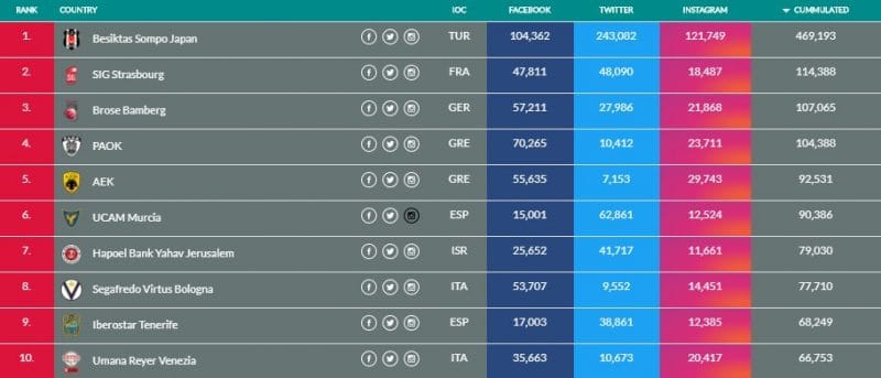 C’est le club turc de Besiktas Istanbul qui est de très loin le numéro 1 avec 469 193 abonnés au total. La SIG est donc deuxième avec 114 388. Le Mans est 13e (51 190), Nanterre 15e (43 851) et Dijon 18e (37 146).