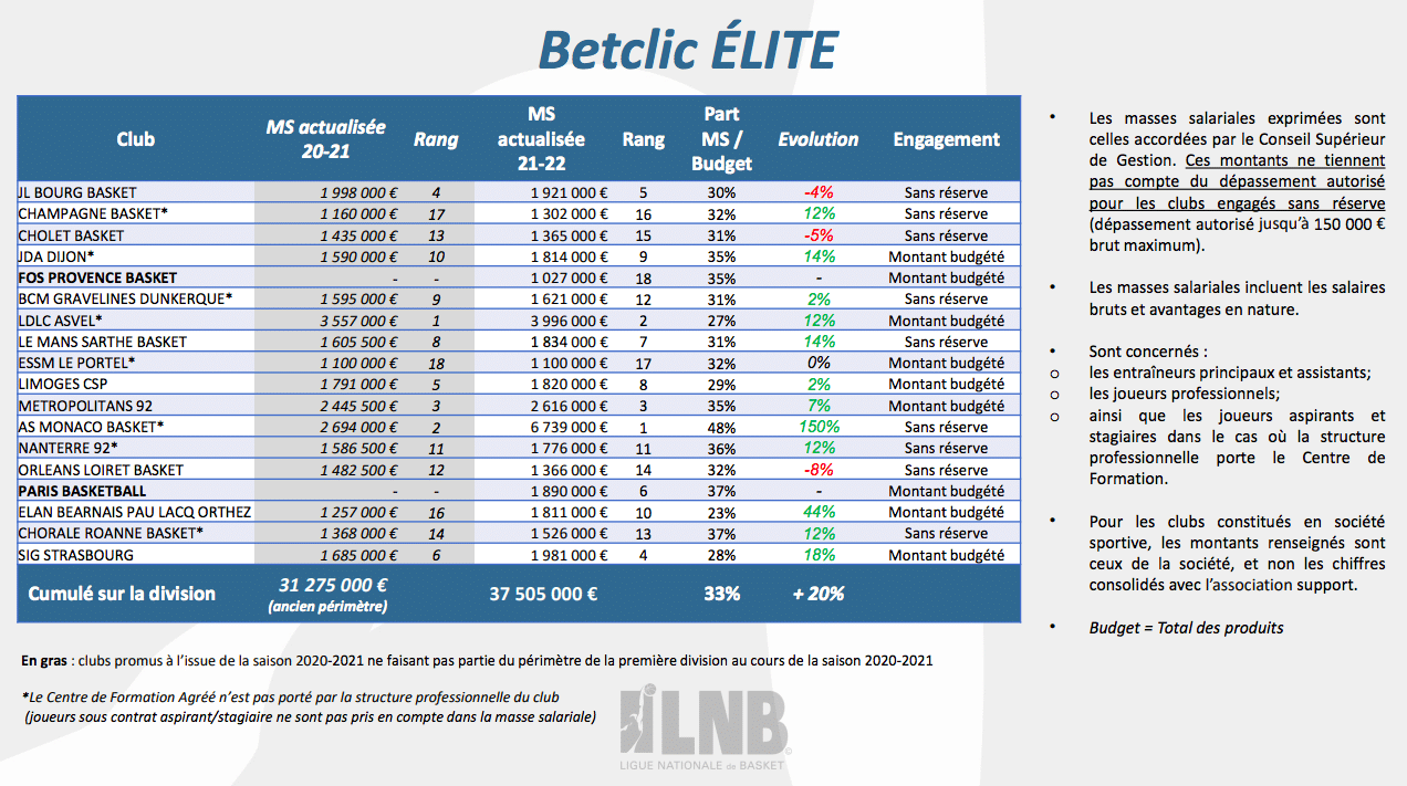 - La hausse généralisée des budgets et des masses salariales des clubs pour la saison 2021-2022 par rapport à la saison précédente, dans un contexte économique difficile et incertain pour plusieurs secteurs, s’explique en grande partie par le soutien sans précédent de l’Etat au secteur du sport professionnel ainsi qu’à la solidarité des abonnés et des partenaires privés des clubs lors de la saison 2020-2021. Sans ces deux soutiens fondamentaux, certains clubs auraient été confrontés à de graves difficultés financières, et le basket professionnel n’aurait pas pu poursuivre sa dynamique positive sur le plan financier. Ainsi, les clubs professionnels ont pu préserver leurs solides situations financières et peuvent avoir des ambitions sportives de nouveau à la hausse pour cette nouvelle saison.