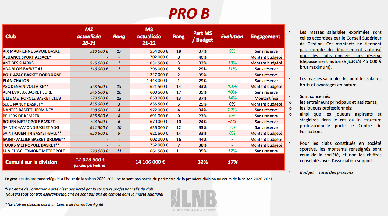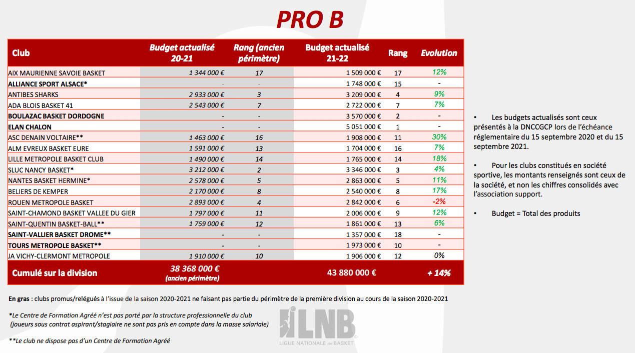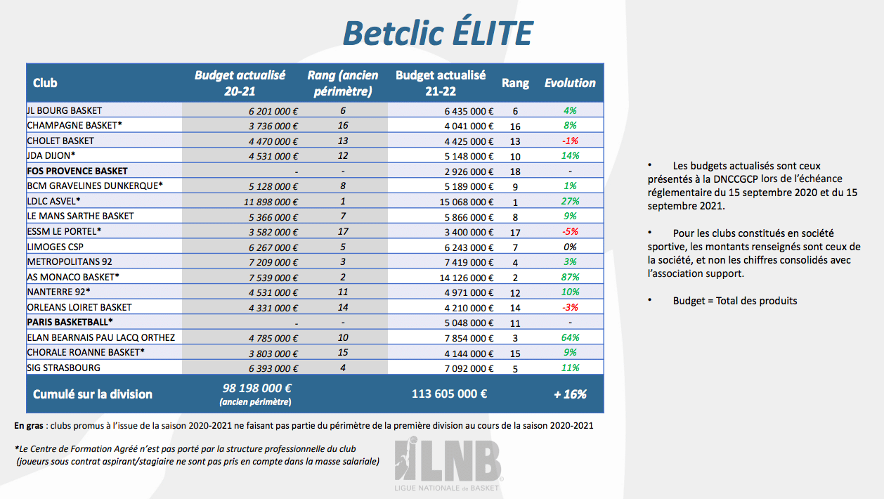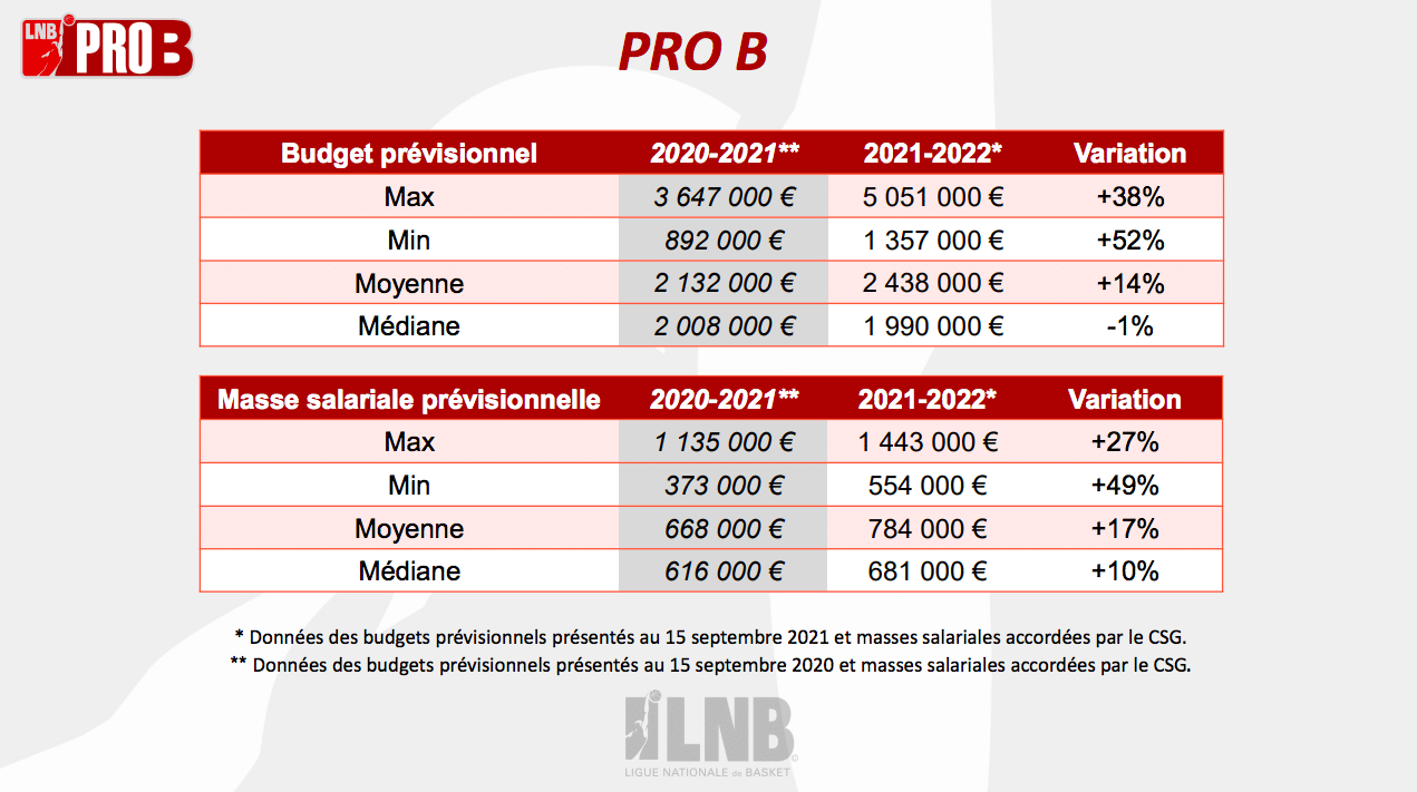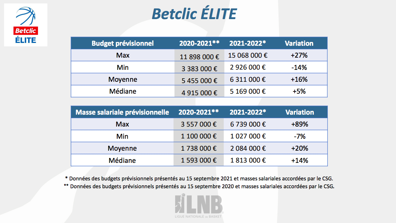 - Après une saison 2020-2021 lourdement impactée par la crise sanitaire, les budgets moyens 2021-2022 des deux divisions, 6.3M d’euros en Betclic ÉLITE (+16%) et 2.4M d’euros en PRO B (+14%), repartent à la hausse et dépassent même les montants records de la saison 2019-2020