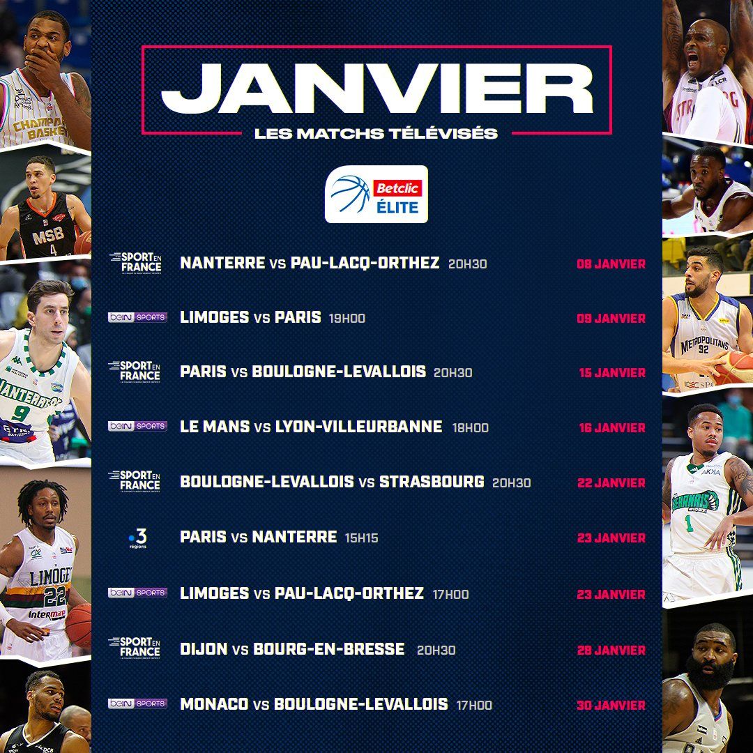 La Ligue Nationale de Basket a publié la liste des matches télévisés en janvier. Ils seront neuf en plus, évidemment de l’ensemble des rencontres sur LNBTV. Le point d’orgue sera le clasico Limoges-Pau.
