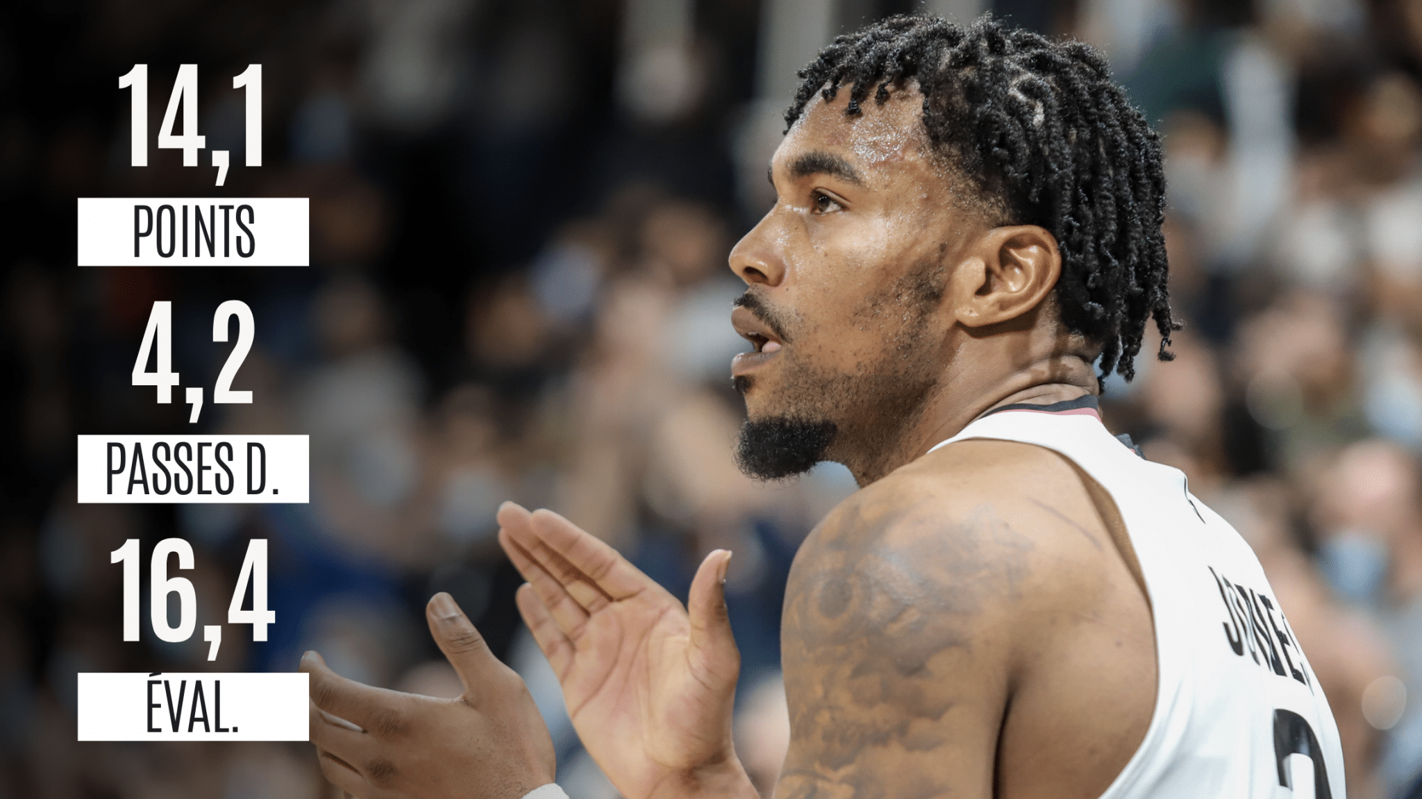 Capable d’élever son niveau dans les gros matchs, tout comme l’intégralité de son équipe, il a surtout pris part à toutes les rencontres de Betclic Élite jusqu’à maintenant, avec 29 rencontres sur 29 possibles. Et celui qui a été décrit par Vincent Collet, son entraîneur, comme « un meneur de jeu exceptionnel qui tient la baraque de façon magnifique », marche littéralement sur l’eau et ce, depuis le tout début de la saison. Pour le premier match des Metropolitans 92, face au Mans, en octobre 2021, il plantait déjà 17 pions. S’en sont suivies des performances impressionnantes, avec notamment une pointe à 35 unités lors de la victoire sur le parquet de Monaco (106 à 115), le 30 janvier 2022. Sans oublier un record personnel à 13 passes décisives, dès son deuxième match en Betclic Élite, remporté sur le parquet du palais des sports Marcel-Cerdan cette fois, mais toujours contre Monaco (108 à 81). Après la 29e journée, le meneur américain pointe à la cinquième place des meilleurs marqueurs du championnat et à la sixième des meilleurs joueurs à l’évaluation.