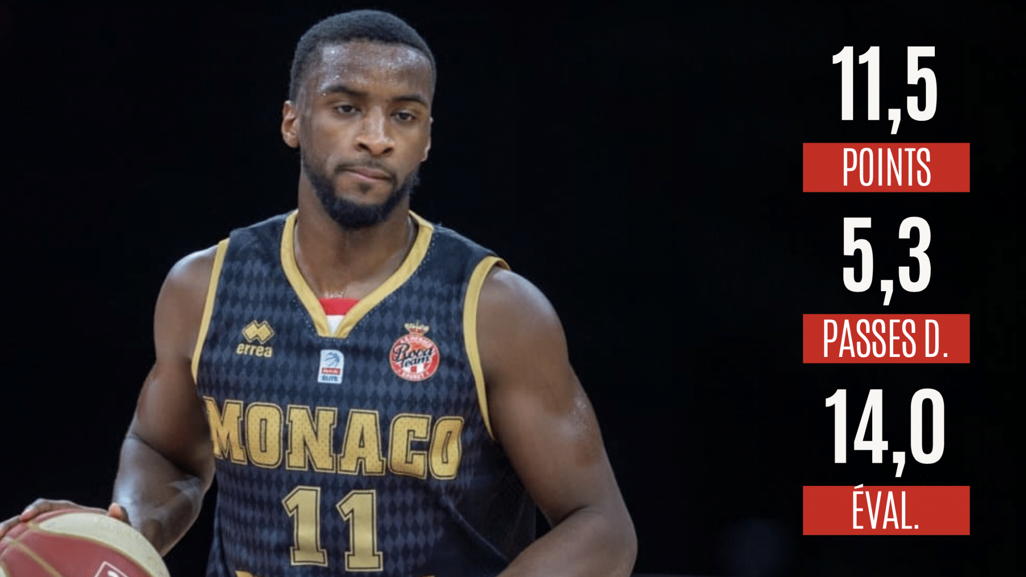 Et enfin, comment parler de la course au titre de MVP sans parler d’un joueur de Monaco, en tête du championnat, ex-aequo avec Boulogne-Levallois et Lyon-Villeurbanne ? Difficile de sortir de cette armada un joueur en particulier, qui aurait pris part à suffisamment de matchs pour pouvoir prétendre à ce titre et pourtant… Il y en a bien un qui pourrait sortir du lot en la personne d’Alpha Diallo (2,01 m, 24 ans). Car, même si ses statistiques sont moins reluisantes que celles des cinq phénomènes cités précédemment ainsi que de certains de ses coéquipiers (notamment Mike James, à retrouver ci-dessous), il n’en demeure pas moins un élément indispensable de l’effectif de Sasa Obradovic.