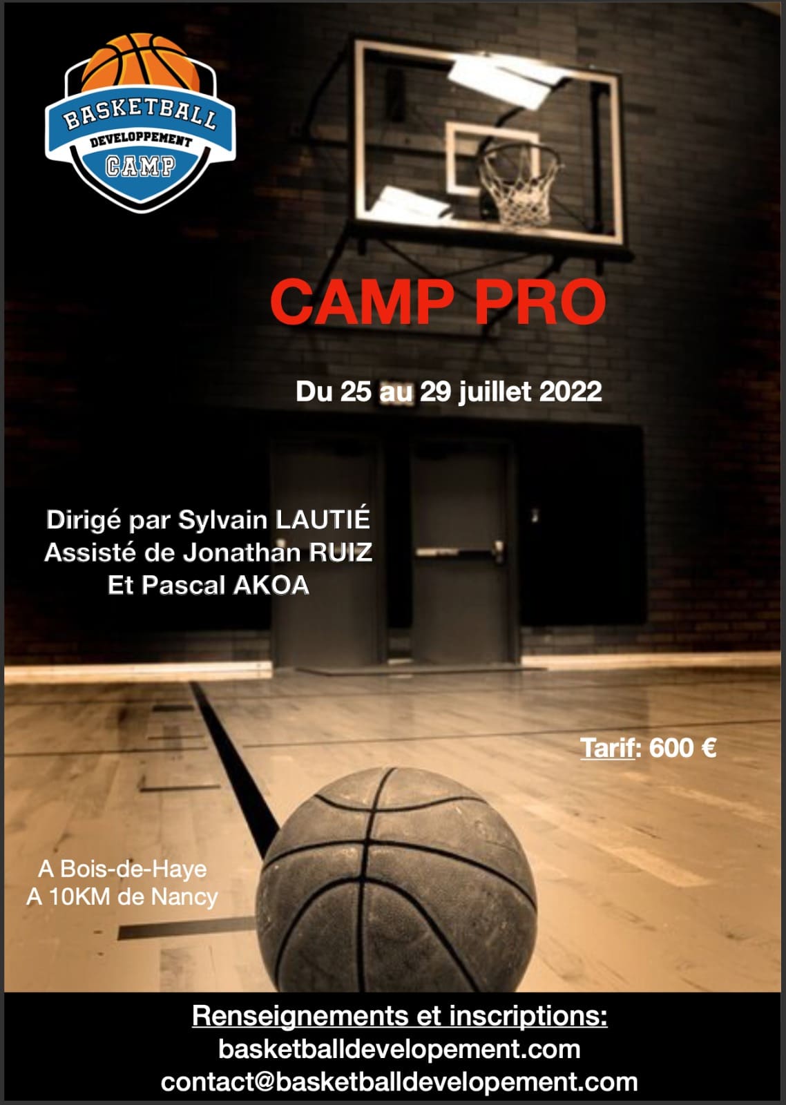 En complément, Basketball Développement organise la deuxième édition de son Camp Pro avec Sylvain Lautié du 25 au 29 juillet sur la région de Nancy (54) à Hoosier Haye.