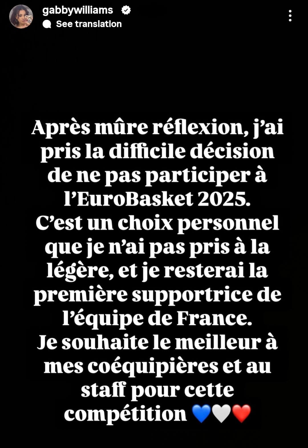 L'équipe de France sera privée à l'EuroBasket de sa meilleure joueuse, Gabby Williams (1,80 m, 28 ans).