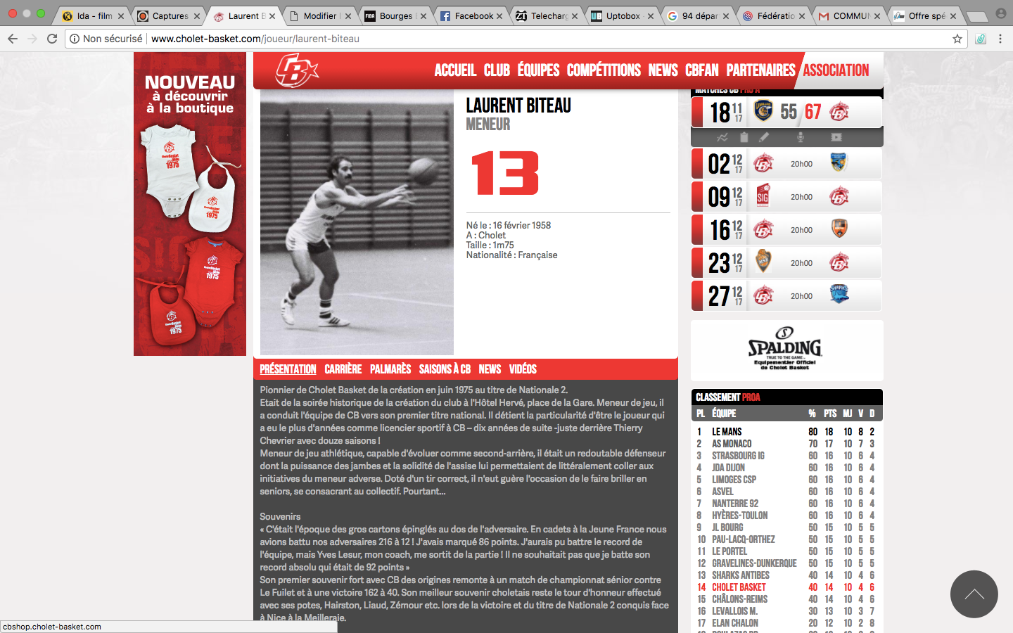 Tout est à l’avenant, notamment les fiches sur les joueurs y compris ceux du centre de formation. Si l’on clique sur DaShaun Wood, on apprécie une foule d’infos, des commentaires, ses stats en carrière, des photos, des vidéos… Plus étonnant encore, Thierry Abélard et Jacques Porscher, de l’équipe inaugurale en 1975-76, ont droit également à une fiche complète. Quant au meneur Laurent Biteau, il est même interviewé et Michel Léger dit de lui que « son rôle très important dans la réussite de Cholet Basket n’est pas assez souligné. »