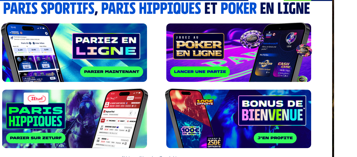 Le partenariat entre Parions Sport et ZEturf élargit les possibilités de paris. Avec le code bonus BASKET110, les passionnés de courses hippiques récupèrent jusqu'à 100€ en crédits de jeu selon le total de leurs mises durant les 30 premiers jours.