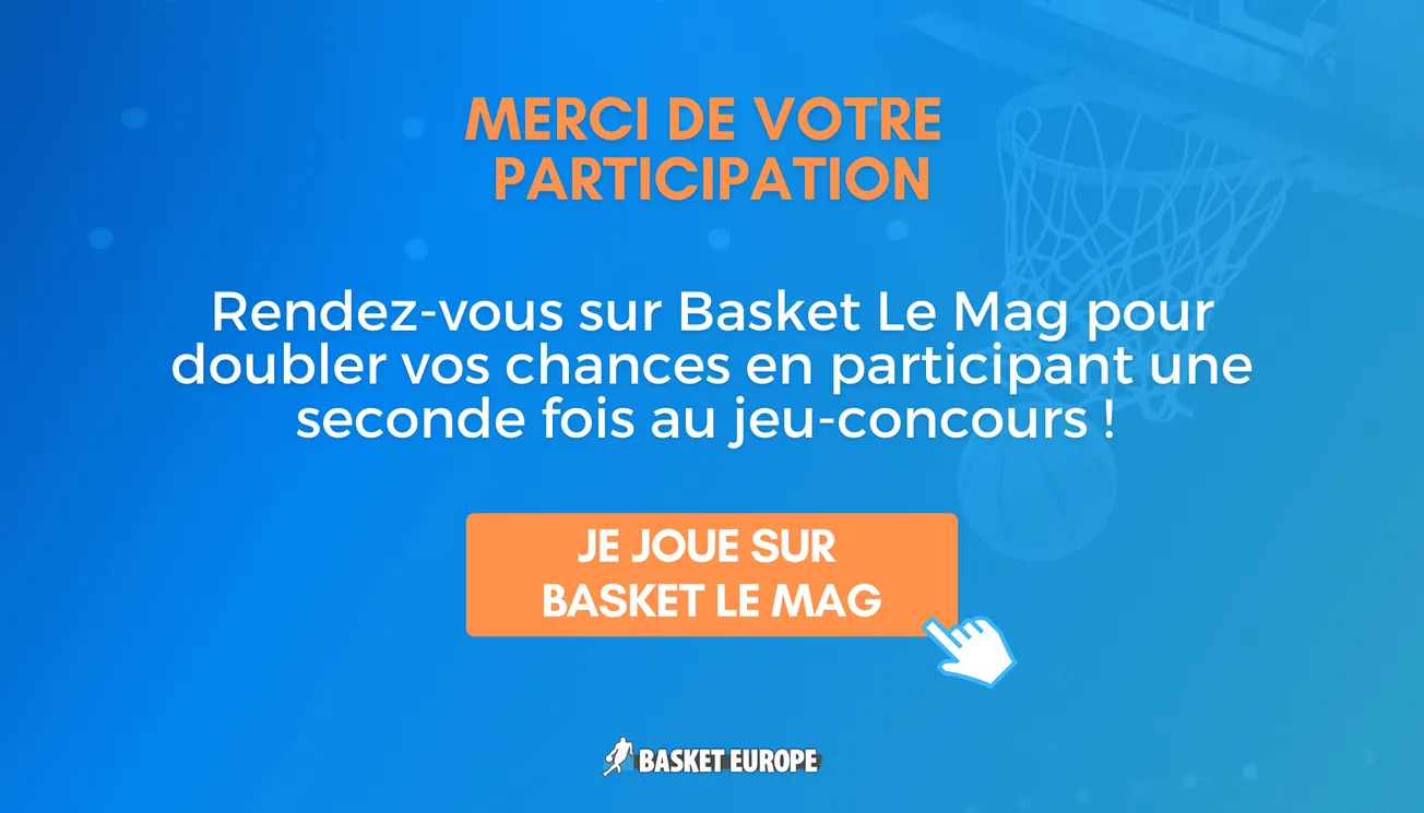 Toute l’équipe de Basket Europe vous remercie pour votre participation. Croisez les doigts et rendez-vous le 4 juillet 2021 pour le tirage au sort. En attendant, doublez vos chances en participant une seconde fois au jeu-concours sur le site de notre partenaire Basket Le Mag 👇