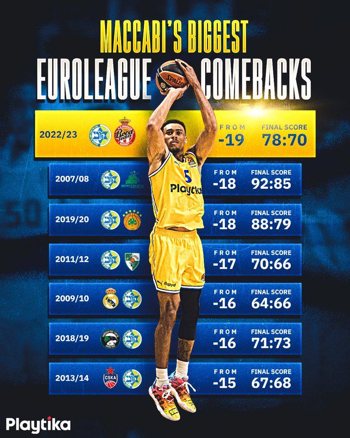 Dans le passé, les Israéliens étaient revenus deux fois de -18. Une fois lors de la saison 2007-08 contre Montepachi Siena et l’autre fois lors de la saison 2019-20 contre le Panathinaikos.