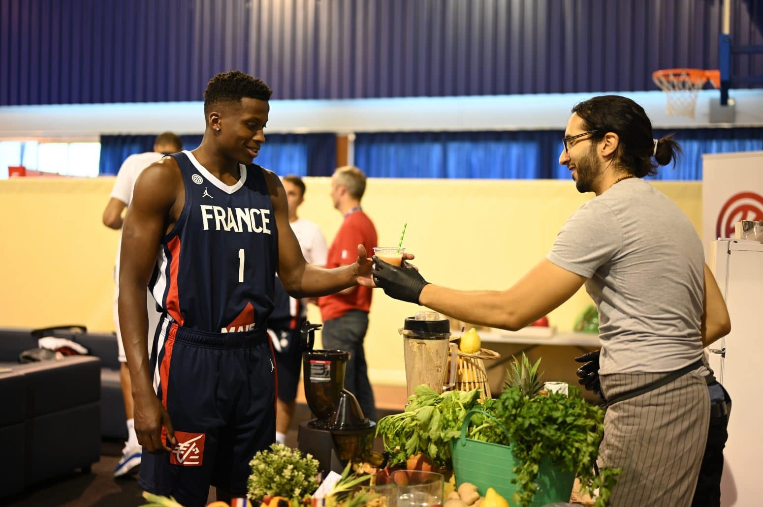 En fin de cette matinée, la rencontre avec la presse et devant une assistance d’une cinquantaine de personnes s’est déroulée dans une atmosphère détendue avec des joueurs disponibles comme ils ne le seront plus de tout le mois d’août consacré à la préparation et du 31 août au -espérons le- 15 septembre à la Coupe du monde. Le passage à l’INSEP, dans le Bois de Vincennes, était une entrée en douceur consacrée aux retrouvailles, à faire connaissance avec certains joueurs moins habitués à ce rassemblement de VIP, aux tests médicaux, aux soins, à la promo et donc aux médias. Chaque joueur était assis avec devant lui une table qui portait son nom -comme en NBA- et autour de lui une grappe de journalistes plus ou moins importante en fonction de sa notoriété.