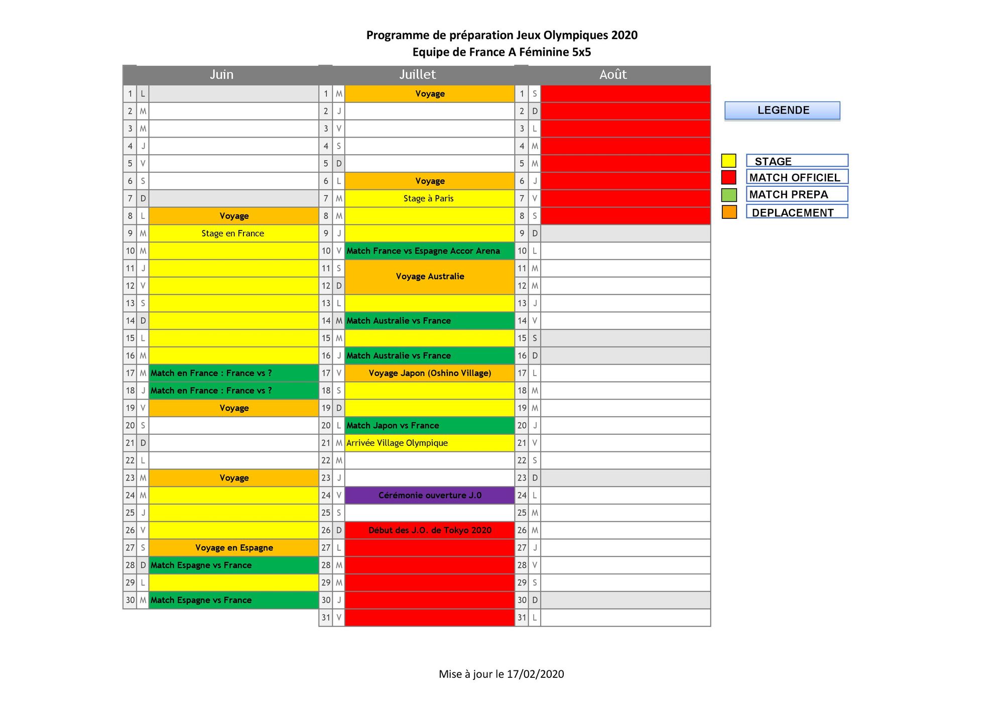 « On commence la préparation le 9 juin. Pourquoi cette date ? S’il y a un cinquième match en finale, le championnat se terminera le 1er juin, » détaille Valérie Garnier. « On va se servir de cette semaine pour faire des examens médicaux ici à l’INSEP. On sera ensuite en stage avant les premiers matches les 17 et les 18. Nous partirons en Espagne, du 24 au 30. Ce n’est pas habituel mais je trouve que c’est bien aussi d’aller à l’extérieur alors qu’on avait tendance à rester un peu chez nous. Une période de repos de 5-6 jours sera nécessaire pour nous retrouver le 7 juillet. Le 10 juillet ça sera le grand rendez-vous des féminines et des masculins contre l’Espagne. Et dans la foulée on partira en Australie dès le lendemain matin puisque deux matches nous y attendent, les 14 et 16 juillet. De l’Australie nous irons à Oshino au Japon pour effectuer un match contre le Japon le 20 juillet. Le début du tournoi olympique est le 27 pour le tournoi féminin. »
