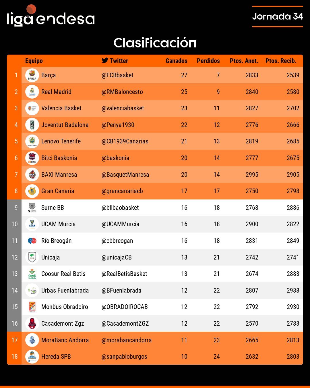 Barcelone a battu Baxi Manresa, 80-94, avec Nicolas Laprovittola à 20 points, Dante Exum à 13 points, Nikola Mirotic à 12 points tandis que Rokas Jokubaitis a cumulé 11 points, six rebonds et six passes. Le Real s’est lui imposé à Gran Canaria, 91-83, avec Guerschon Yabusele comme meilleur marqueur avec seulement 13 points.