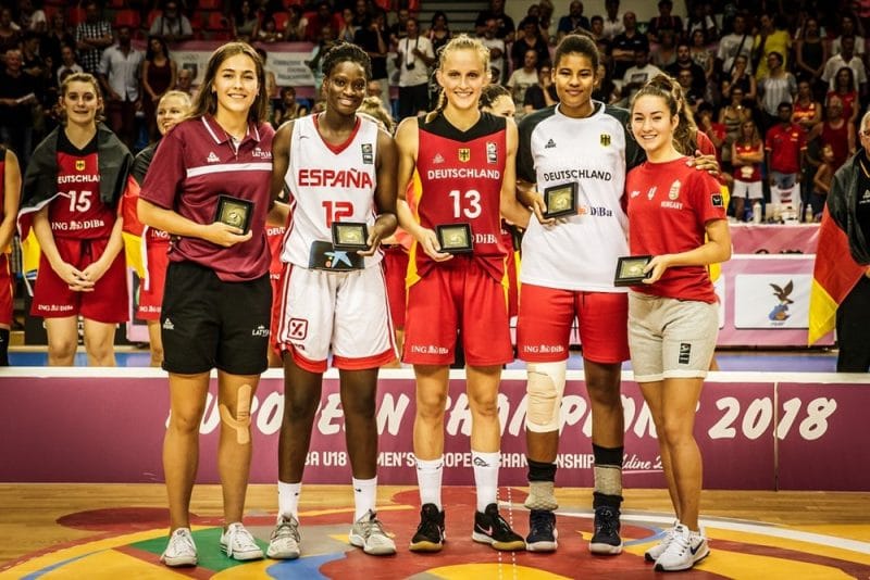 La shooting guard de grande taille (1,89m), Leonie Fiebich a propulsé l’Allemagne vers un premier titre historique féminin U18 dimanche soir, en battant l’Espagne 67-54 en finale. Elle a assuré 22 points (4/7 à trois-points) et 11 rebonds alors que sa coéquipière Emily Bessoir a compilé 10 points, 9 rebonds et 6 passes.