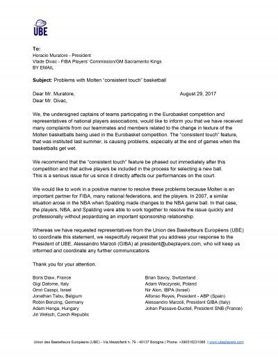 Dans ce courrier, les joueurs souhaitent à l’avenir être associés à ce type de décision et que la FIBA revienne au type de ballon Molten qui était utilisé jusqu’alors. Ils précisent que la NBA avait été confrontée en 2007 aux mêmes problèmes avec un ballon Spalding et qu’une solution avait été trouvée en commun.