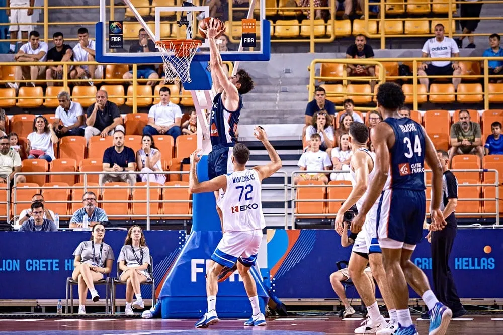Les Bleuets ont dû endurer au début du match des "Hellas... Hellas..." et quelques sifflets du public crétois à Héraklion, mais ils ont vite éteints ses velléités car leur domination a été totale avec encore une fois une défense féroce. Les Grecs ont crû s'en sortir en dépensant leurs munitions derrière l'arc mais sans aucune réussite (3/17 à la mi-temps). Si une individualité doit ressortir, c'est Maxime Raynaud (15 points 7/9 aux tirs et 5 rebonds en 18 minutes), mais c'est tout le collectif des Bleuets qui est à louer.