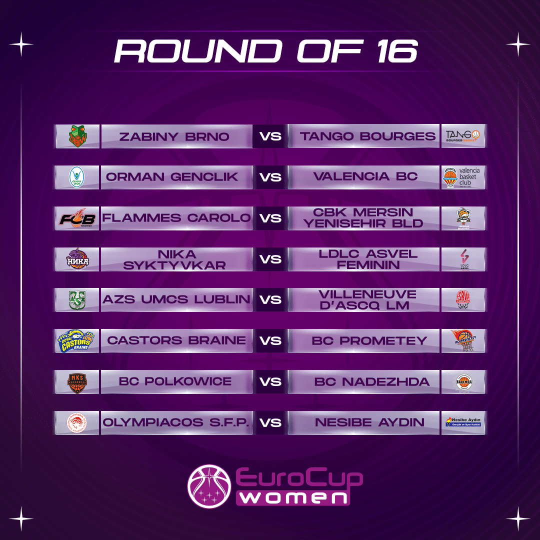 Le match aller entre l’Olympiacos et Nesibe Aydin lèvera le rideau sur les huitièmes de finale le mardi 11 janvier. Zabiny Brno affrontera Bourges le lendemain, tandis que les six matches restants débuteront le jeudi 13 janvier. Les matches retour sont prévus respectivement le mercredi 19 janvier et le jeudi 20 janvier.