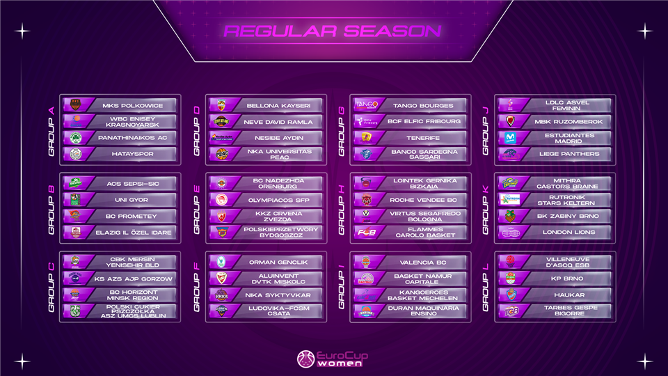 Comme annoncé précédemment, quatre autres équipes – ACS Sepsi-SIC (ROU), Bellona Kayseri Basketbol (TUR), Tango Bourges (FRA) et Valencia BC (ESP) – sont entrées dans la saison régulière via les qualifications de l’EuroLeague .