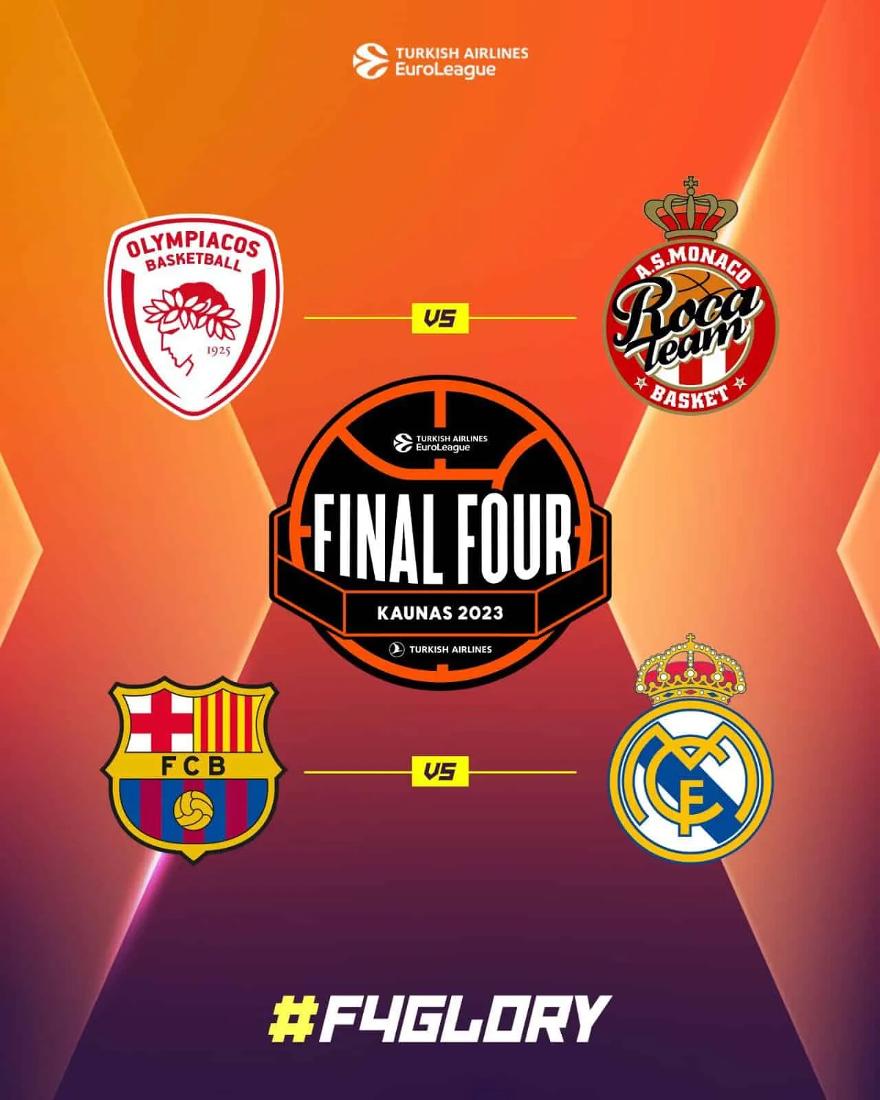 Mercredi soir, l’AS Monaco et le Real Madrid ont rejoint l’Olympiakos et le FC Barcelone au Final Four de l’Euroleague en battant respectivement le Maccabi Tel-Aviv (97-86) et le Partizan Belgrade (98-94). Découvrez le programme du Final Four 2023 de Kaunas (19-21 mai).