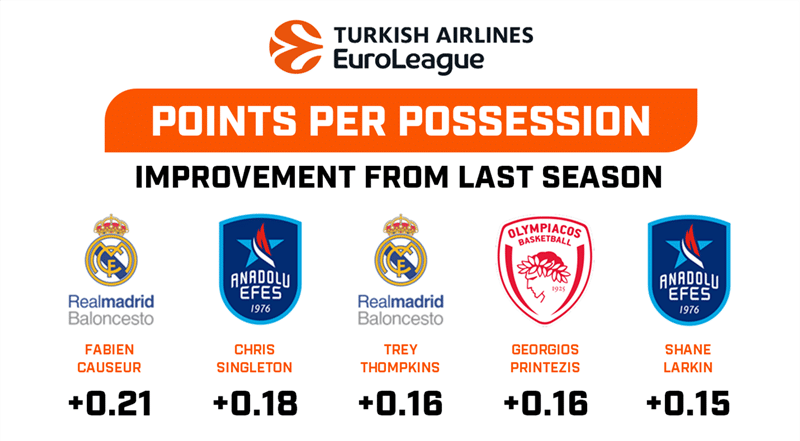 Suivent ex-aequo le pivot du Real Trey Thompkins et le vieux grognard de l’Olympiakos Georgios Printezis, dont la production a augmenté de 0,15 point par possession (un remarquable 1,41 point sur 7,7 possessions pour le premier ; 1,15 point pour 10,3 possessions pour le second). Cinquième, Shane Larkin, coéquipier de Chris Singleton, fait exploser les compteurs à tous les niveaux : d’une saison à l’autre, il est passé de 12,5 à 22,2 points par match, le tout avec une adresse en hausse (50,9 % à trois-points tout de même, sur quasiment 7 tentatives par match !). Résultat, le néo-Turc est passé de 1,14 point à 1,29 point par possession en progressant par ailleurs de 10,8 possessions par match l’an dernier à 17,1 cette année. Croqueur certes, mais rentable… Et l’Anadolu Efes est en tête de l’Euroleague. Le club ne se plaint certainement pas de ses services !