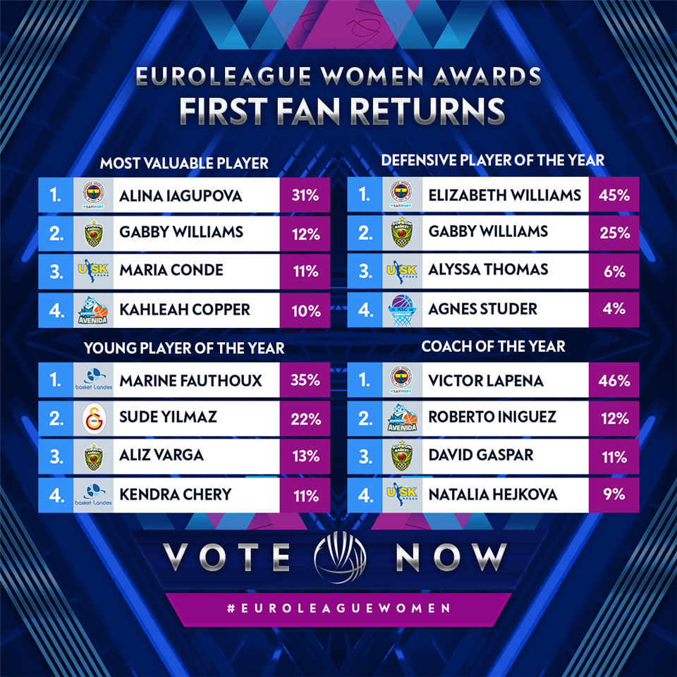 Ainsi, la Landaise Marine Fauthoux est en tête dans la catégorie des jeunes, alors que Gabby Williams (Sopron) est positionnée à la 2e place au trophée de MVP et à celui de Défenseur de l’Année dont elle est la tenante. Sandrine Gruda (Schio), Kendra Chery (Basket Landes) et Olivia Epoupa (Lattes-Montpellier) apparaissent également dans les classements. A noter que les joueuses de Fenerbahçe trustent les premières places, ce qui met en évidence… la force de ses fans.