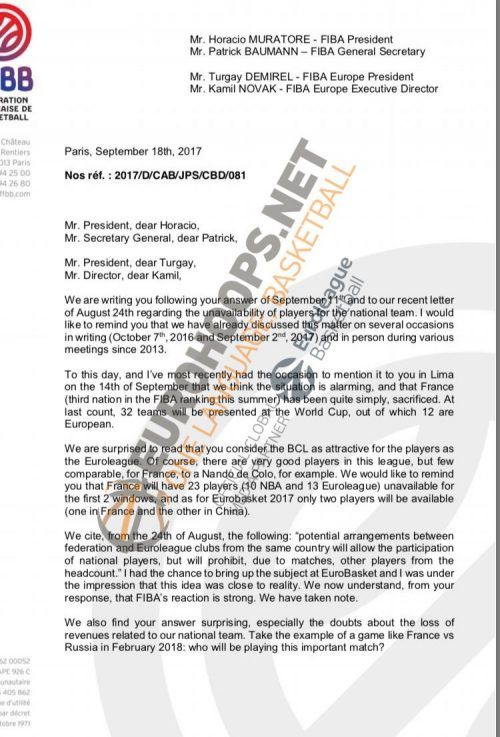 J’ai reçu, j’ai lu tout ça. Je n’ai absolument aucune confiance en Jordi Bertomeu (NDLR : le directeur d’ECA). Je pensais que c’était un personnage qui voulait composer pour l’intérêt général. Aujourd’hui, je n’ai strictement plus aucune confiance en lui. Je respecte le travail de bonifier certains intérêts privés, d’une structure privée qui est là pour gagner de l’argent, mais nous on est service public, notre mission c’est l’intérêt général. J’ai là tout le dossier (il le montre). On a un agrément qu’avait fait la fédération internationale avec l’Euroleague sur la demande expresse de la Commission Européenne. La FIBA a tout lâché sur ce dossier… ECA a signé cet agrément et une heure après envoyait un mail à la Commission Européenne en disant qu’ils n’étaient plus d’accord. Ça a toujours été comme ça. En novembre 2016 –j’ai le courrier ici-, l’ECA a confirmé ce qu’ils avaient dit à la Commission Européenne qu’ils allaient respecter les fenêtres. Ils ne les ont pas respecté et comme par hasard, huit jours avant le début de la compétition, on cherche un produit alternatif alors que tout est bouclé. Moi, le premier, je serais ravi que l’on joue l’été mais ce n’est pas que l’Europe, c’est le monde entier qui est concerné. C’est pour dire qu’encore une fois « j’ai fait une ouverture et encore une fois la FIBA a refusé ». L’Euroleague dit qu’ils sont d’accord avec moi pour que l’on fasse sauter le projet FIBA. Ce n’est pas ça. Moi, je veux les joueurs pour jouer les fenêtres.
