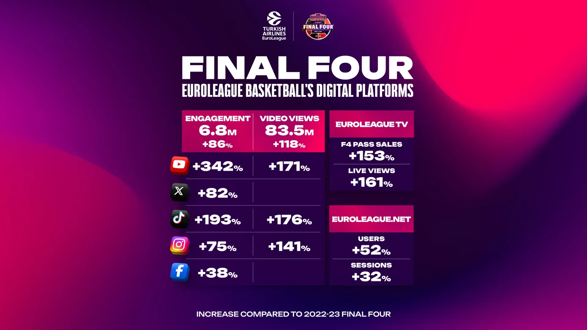 Le site de l’évènement, Euroleaguebasketball.net a quant à lui été visité avec 50 % de plus d’utilisateurs qu’en 2023. De son côté, la plateforme de visionnage Euroleague TV a elle aussi assisté à une augmentation de 161 % de ses téléspectateurs durant le Final Four 2024.
