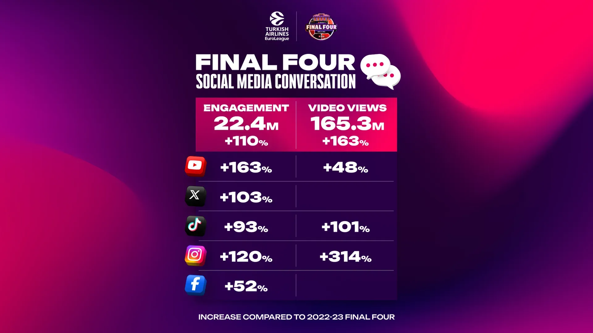 165,3 millions, c’est le nombre de fois qu’ont été visionnées les vidéos du Final Four de l’Euroleague 2024 sur les différentes plateformes de réseaux sociaux. Il s’agit d’une augmentation de 163 % par rapport à l’édition précédente. Les interactions digitales, elles, ont augmenté 110 % vis à vis du carré final 2023, s’élevant à 22,4 millions tous réseaux confondus. Une première pour un évènement de basket européen.