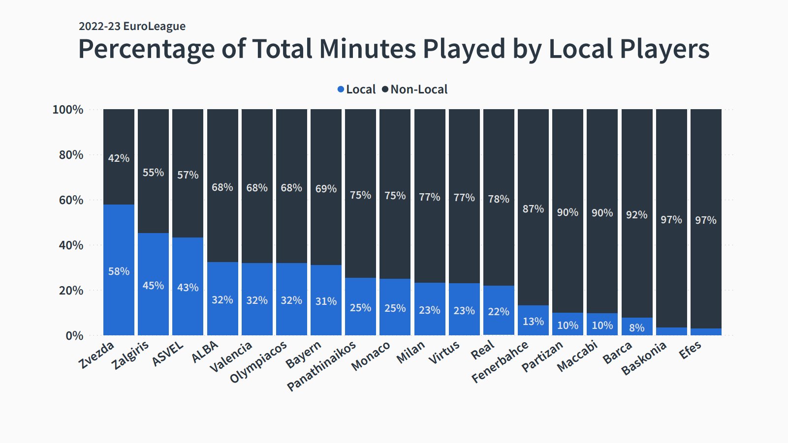En terme de minutes accordées aux joueurs locaux, l’ASVEL est 3e au palmarès et l’AS Monaco 9e.