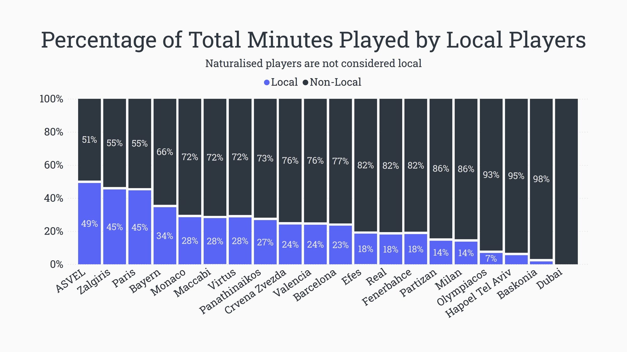 Il faut se rappeler que la notion de nationalité n'intervient pas en Euroleague, ce qui fait que le Dubaï BC n'a aucun Doubaïote dans son roster. Pas surprenant pour une équipe artificielle qui doit sa place dans la compétition aux dollars investis et à la stratégie de fuite en avant de l'Euroleague.