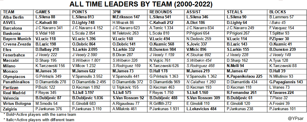 Le journaliste grec Yannis Psarakis a publié un intéressant document où sont listés les meilleurs joueurs pour six catégories statistiques pour les 18 clubs d’Euroleague depuis 2000.