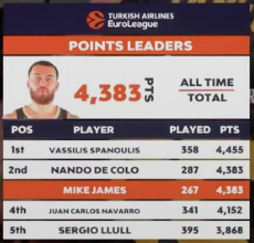 Il fallait 19 points à Mike James pour revenir à hauteur de Nando De Colo. Contrat validé par le meneur américain ce mercredi soir lors de la victoire de l’AS Monaco contre le Partizan Belgrade. Avec 4 383 points inscrits en carrière en Euroleague, il n’est plus qu’à 72 unités de battre le record all-time de Vassilis Spanoulis (4 455).