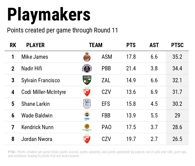 "Sylvain Francisco et Codi Miller-McIntyre méritent une place intéressante dans ce classement. Bien qu'ils ne marquent pas énormément de points par rapport aux autres joueurs, ce duo figure parmi les trois meilleurs en termes de points créés grâce aux passes issues des pick-and-rolls. Même sans passes décisives directes, la pression qu'ils exercent sur les défenses adverses permet souvent à leurs coéquipiers de marquer, même si les défenseurs du côté faible parviennent à revenir à temps pour contester la première passe. La capacité de Francisco à pénétrer en un-contre-un et le talent de Miller-McIntyre pour orchestrer les contre-attaques sont également remarquables."