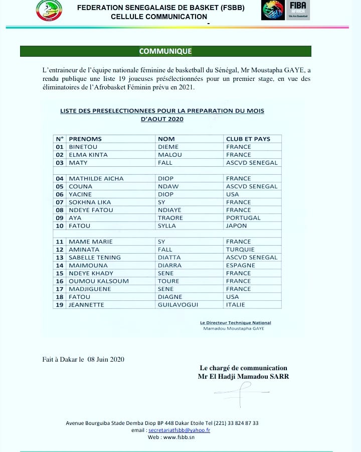Outre Bintou Marizy-Dieme, à noter la présence dans la liste d’une autre doyenne, Mame Marie Sy-Diop (1,85m, 35 ans), qui possède également le passeport français, et qui est en LFB depuis 2001; elle sera à la rentrée sous le maillot de Charleville.