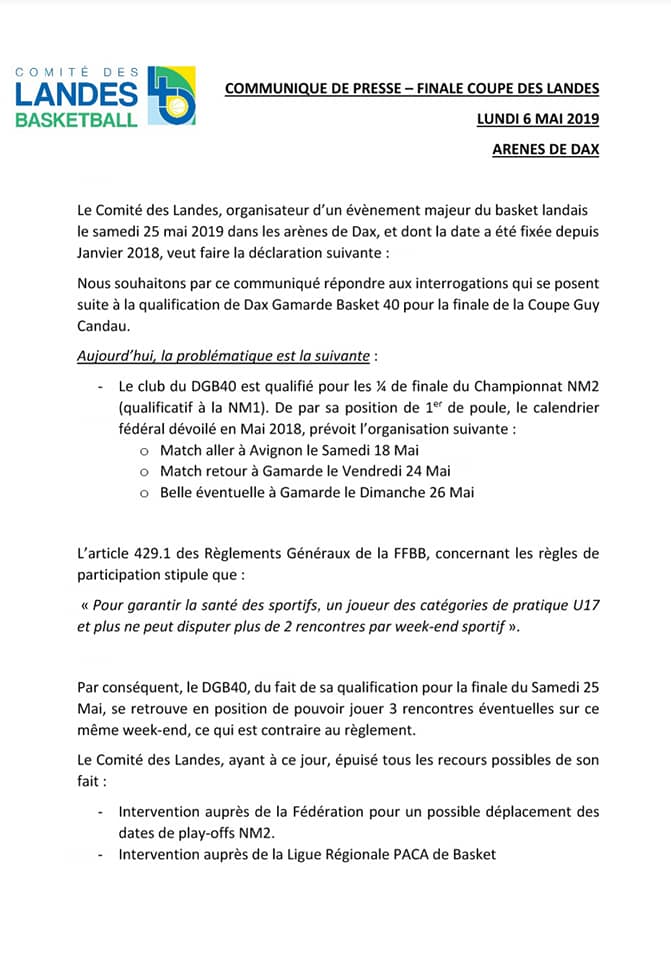 Le Comité des Landes de basket-ball a demandé au club dans un communiqué de presse de se positionner. Quel choix cornélien quand on connait pour un Landais l’importance de SA coupe départemental qualifiée de Coupe du Monde des Landes !