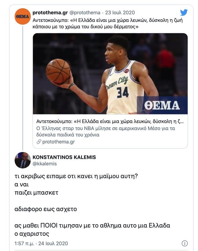 Konstantinos Kalemis, instructeur interculturel au Conseil pour l’Europe et coordinateur de l’éducation des réfugiés au ministère grec de l’Éducation a été démis de ses fonctions en raison de ses insultes raciales sur les réseaux sociaux envers le MVP en titre de la NBA et international, Giannis Antetokounmpo.