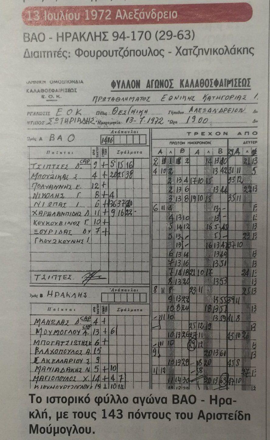 Ce jour de juillet 1972, Iraklis avait un match à domicile contre VAO (Vizantinos Athlitikos Omilos) Salonique remporté 172-94. L’entraîneur d’Iraklis avait été précis dans ses indications tactiques: «Le ballon en permanence à Aristides ! ». Lequel a déclaré plus tard: