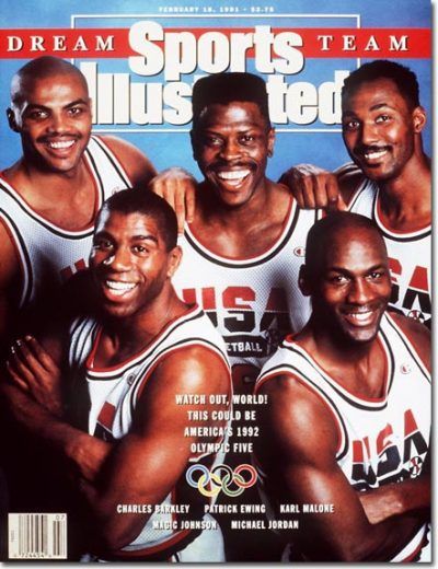 Le staff de la NBA aussi a passé la surmultiplié et son commissionner, David Stern, a compris que le marché était désormais global. Les grands manitous de la ligue ont une idée de génie : regrouper les 11 (plus un universitaire, Chris Laettner) meilleurs joueurs sous le label « équipe de rêve ». Tous acceptent, y compris Jordan qui est plus que jamais valorisé par Nike avec notamment une gigantesque pub sur la façade d’un immeuble de Barcelone. Quant à Magic Johnson, il a stupéfait le monde en annonçant sa séropositivité quelques mois plutôt et en gagnant pour son retour le titre de MVP du All-Star Game. Jordan se met même un peu en retrait à Barcelone pour lui laisser le leadership médiatique. Une photo prise au All-Star Game par l’hebdo Sports Illustrated réunissant sous le maillot étoilé Jordan, Magic, Charles Barkley, Karl Malone et Pat Ewing fait le tour du Monde et sert de formidable teasing. Le concept Dream Team est aussi un big business avec des retombées estimées en amont à 30 millions de dollars mais qui sont en fait… inestimables.