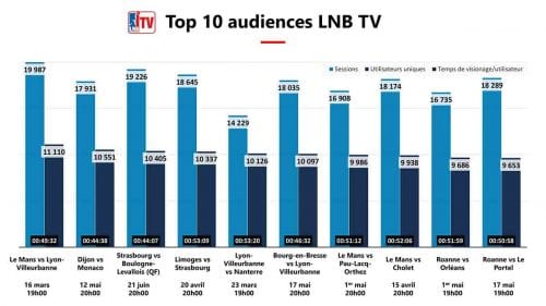 *Le Limoges CSP a obtenu, pour la saison 2020-21, la meilleure audience moyenne sur LNBTV avec 12 021 sessions, devant Le Mans SB (11 572) et l’ASVEL (11 459). Au niveau des matches, le record a été établi, le 6 mars, par Le Mans vs ASVEL (19 987 sessions) devant Strasbourg vs Boulogne-Levallois (19 226) et Limoges vs Strasbourg (18 646).