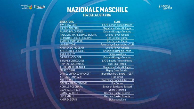 Alors que le conflit FIBA/Euroleague n’est toujours pas résolu, Romeo Sacchetti a fait comme son confrère Vincent Collet pour la France, en retenant cinq joueurs qui portent le maillot de clubs d’Euroleague: Simone Fontecchio et Awudu Abass (Olimpia Milan), Luigi Datome et Nicolò Melli (Fenerbahce) et Daniel Hackett (Bamberg).