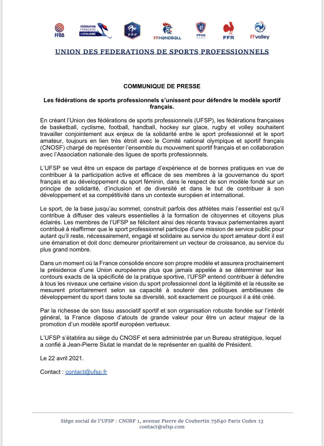 Les fédérations françaises de basketball, cyclisme, football, handball, hockey sur glace, rugby et volley ont pris la décision de s’unir et de créer l’Union des fédérations de sports professionnels (UFSP), qui sera présidée par celui de la FFBB, Jean-Pierre Siutat.