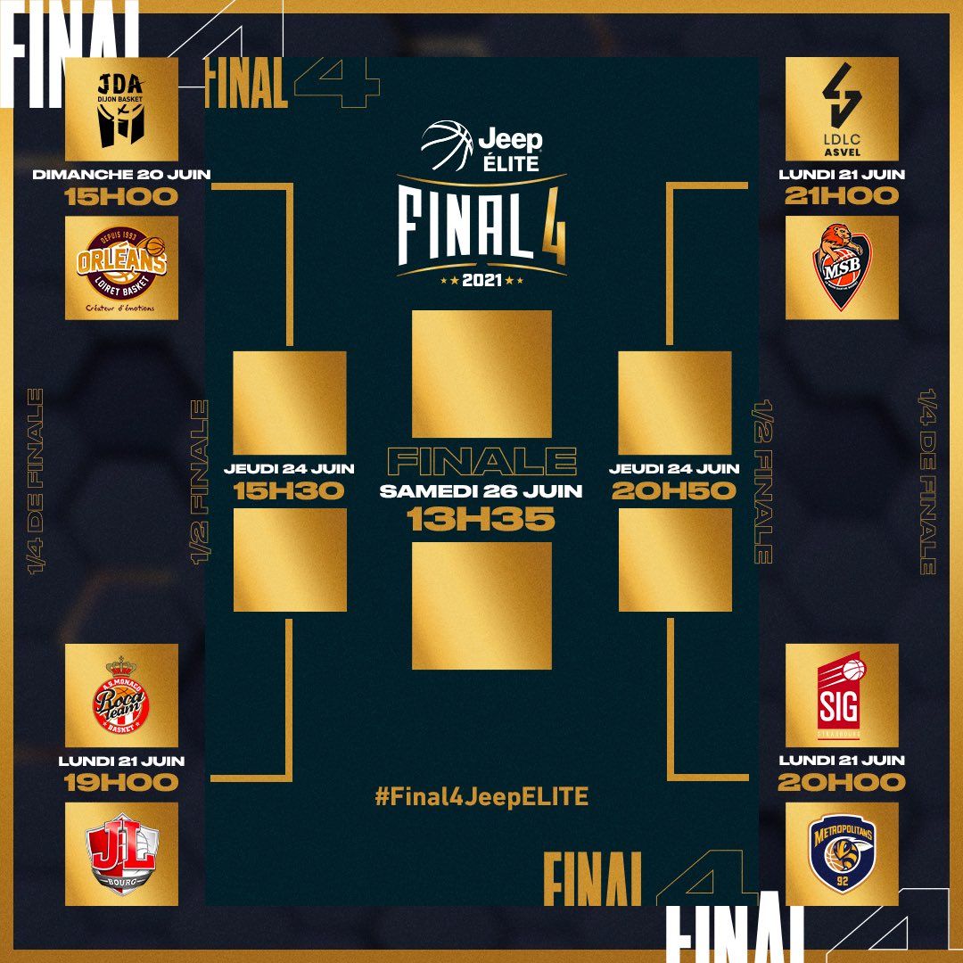 Final 4 au Kindarena de Rouen: Jeudi 24 juin : Demi-finales à 15h30 et 20h50 en direct sur la chaîne L’Equipe; Samedi 26 juin : Finale à 13h35 en direct sur la chaîne L’Equipe.