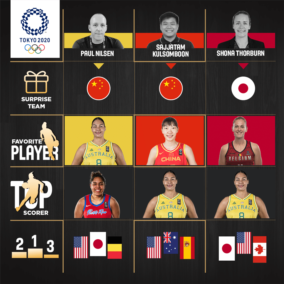 « Après tout ce que le monde a vécu en 2020, j’ai sérieusement besoin de croire en un conte de fées pour 2021. Je ne suis pas anti-USA, et elles gagneront probablement, évidemment, comme 90% du temps, elles sont ultra favorites. L’or pour le Japon serait juste une histoire incroyable mais c’est désormais une possibilité lointaine après les blessures subies par Tokashiki et Motohashi, qui pourraient rater l’événement. Des nations comme l’Australie, la France ou même le Canada ou la Belgique ont peut-être une chance. Ces dernières pourraient se faufiler pour le bronze. »Paul Nilsen, spécialiste FIBA.