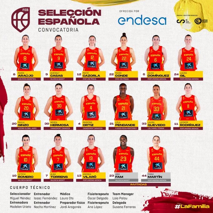 « Nous avons appelé 15 joueuses qui commenceront l'entraînement le 15 juin à Vigo et deux semaines avant notre voyage à Paris, la joueuse naturalisée nous rejoindra. Dans la première partie du rassemblement, il y aura aussi deux jeunes joueuses que nous voulons continuer à développer. Nous déciderons qui sera notre naturalisée dans les semaines à venir, » a indiqué Miguel Mendez.