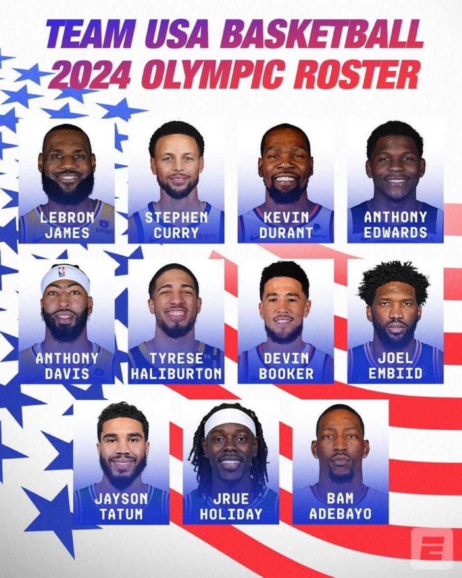 ESPN Sources: USA Basketball is finalizing its 2024 Paris Olympics roster with Steph Curry, LeBron James, Kevin Durant, Jayson Tatum, Joel Embiid, Devin Booker, Tyrese Haliburton, Anthony Edwards, Jrue Holiday, Bam Adebayo and Anthony Davis. Team may initially keep one open spot. pic.twitter.com/kO7TREBVDK
