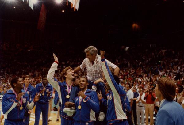 Alors que ses joueurs joueurs voulaient le porter en triomphe, Bobby Knight cria : « d’abord coach Iba ! » Il exigeait qu’un hommage soit rendu à l’un de ses modèles, patron de l’équipe olympique victorieuse en 64 et 68, mais aussi honni par toute l’Amérique du basket-ball pour avoir mené ses troupes à l’incroyable défaite à Munich en 72 face à l’URSS. Et puis ce fut autour de Bobby Knight de s’asseoir sur les épaules de ses joueurs, le filet autour du cou, de lever le bras. Et puis, seulement là, le général laissa apparaître un sourire.
