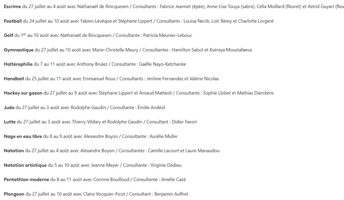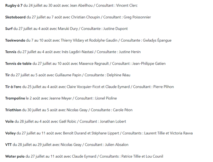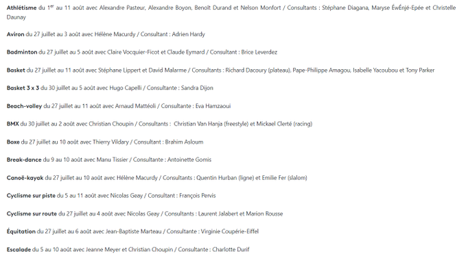 Pour le basket 5x5, autour des journalistes Stéphane Lippert et David Malarme, Richard Dacoury, en plateau, Tony Parker, Pape-Philippe Amagou et Isabelle Yacoubou seront au micro. Et pour le basket 3x3, le journaliste Hugo Capelli aura comme consultante Sandra Dijon.
